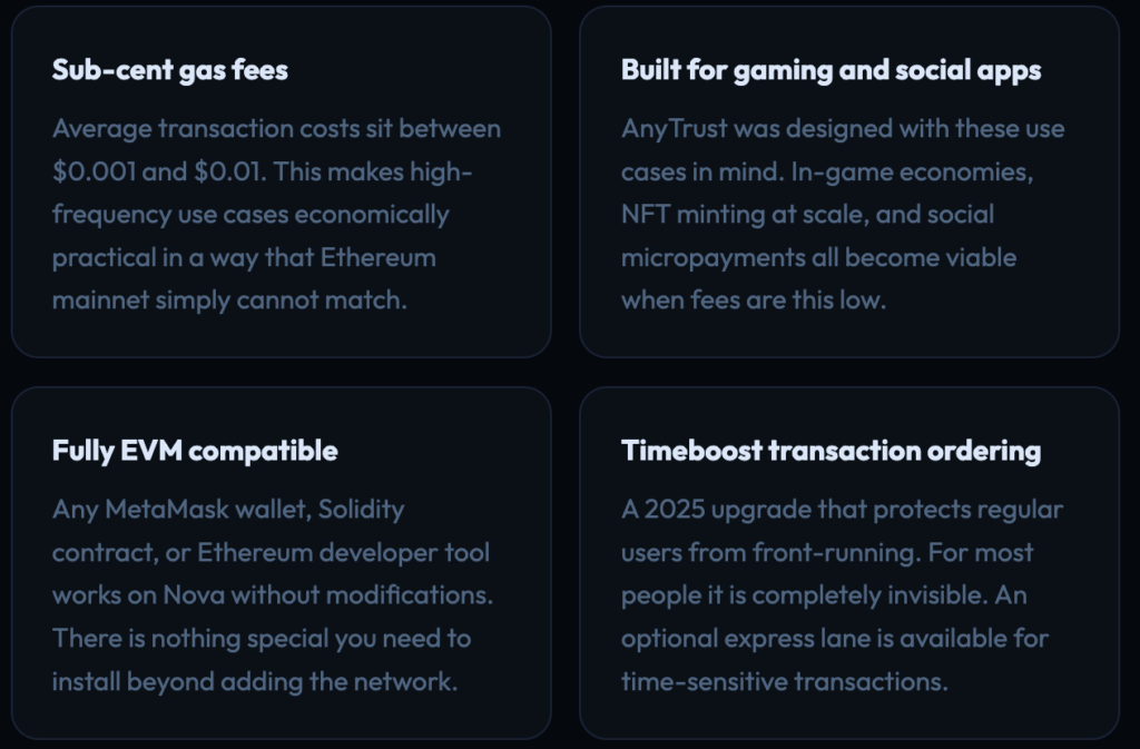 Arbitrum Nova is a Layer 2 network built on top of Ethereum by Offchain Labs, the same team behind Arbitrum One. Both chains reduce Ethereum gas fees significantly, but Nova uses a different technology called AnyTrust. This was designed for applications that need to handle very high transaction volumes at near-zero cost. Think blockchain games, social apps, NFT platforms, and tipping systems where users make dozens of small transactions per session.