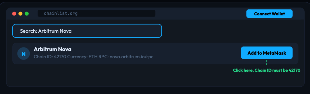 Type Arbitrum Nova in the search bar. Find the result that shows Chain ID 42170 and click Add to MetaMask next to it.