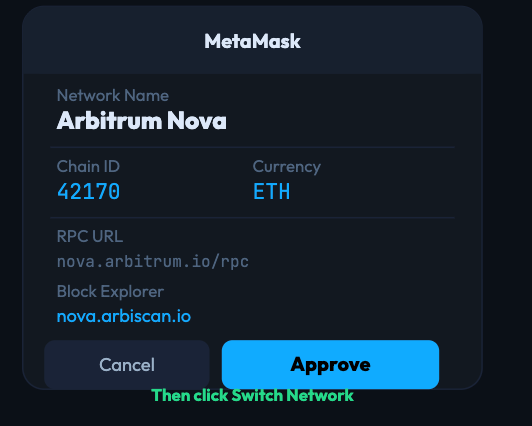 Click Save. MetaMask will confirm the network was added and ask if you want to switch to it now. Click Switch to Arbitrum Nova and you are all set.