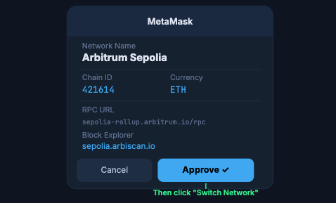 A MetaMask popup will appear with the network details. Review them, click “Approve”, then “Switch Network” to activate Arbitrum Sepolia immediately.