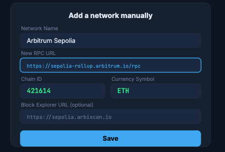Enter each field exactly as shown in the table above. Double-check the Chain ID — it must be 421614, not 421613 (deprecated Goerli).