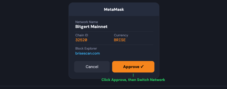 MetaMask will display a confirmation popup with the network details. Review them, click “Approve”, then click “Switch Network” to activate Bitgert immediately.