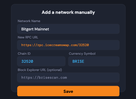 Use the manual setup method with the parameters in the table above. Cross-reference the Chain ID (32520) and RPC URL with BriseScan’s footer or Bitgert’s official documentation.