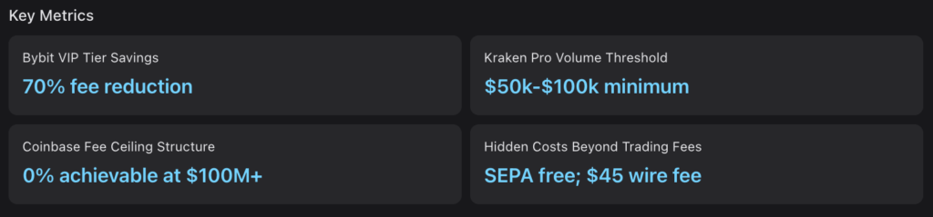 Action steps: Calculate actual 30-day trading volume, including all entry/exit transactions, cross-reference volume tier thresholds on each exchange’s current fee page (tier requirements changed 3x in 2024-2025), Account for deposit/withdrawal fees ($45-250 annually) in total cost calculation, set quarterly fee tier audits to catch downward migrations due to lower activity.