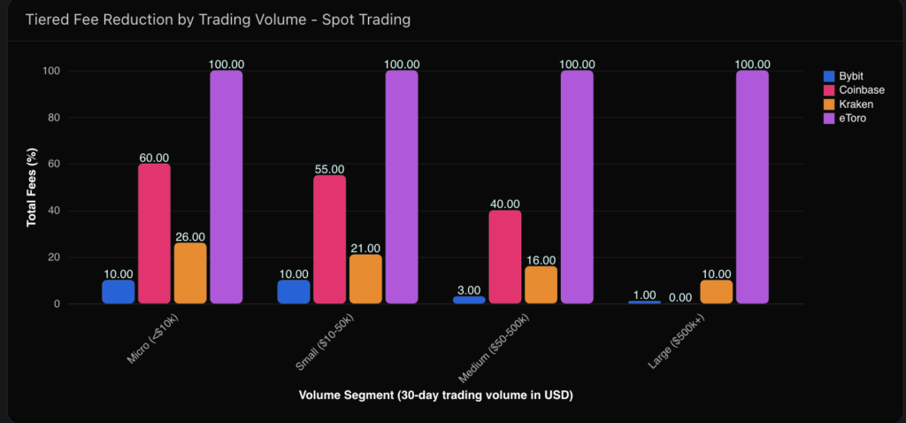 If you trade between $50k and $500k per month, Kraken Pro is the better option. At this level, maker fees usually fall between 0.10% and 0.16%, which is far cheaper than eToro’s flat 1% and still noticeably lower than Coinbase. Even with Kraken’s roughly $45 wire fee, the savings add up once you’re doing 50 or more trades per month. Expect around $300 to $500 in monthly savings versus eToro, or $100 to $200 versus Coinbase. It’s worth checking your fee tier every few months to make sure you stay above the $50k threshold.